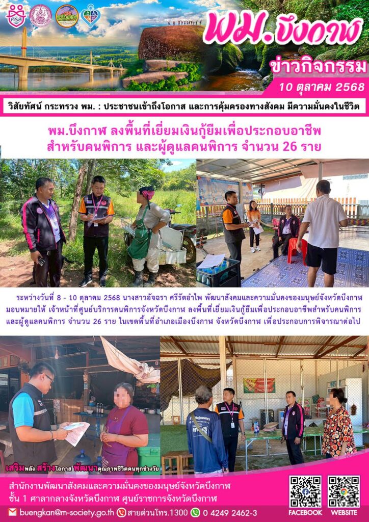 นางสาวอัจฉรา ศรีรัตอำไพ พัฒนาสังคมและความมั่นคงของมนุษย์จังหวัดบึงกาฬ มอบหมายให้ เจ้าหน้าที่ศูนย์บริการคนพิการจังหวัดบึงกาฬ ลงพื้นที่เยี่ยมเงินกู้ยืมเพื่อประกอบอาชีพสำหรับคนพิการและผู้ดูแลคนพิการ จำนวน 26 ราย ในเขตพื้นที่อำเภอเมืองบึงกาฬ จังหวัดบึงกาฬ เพื่อประกอบการพิจารณาต่อไป