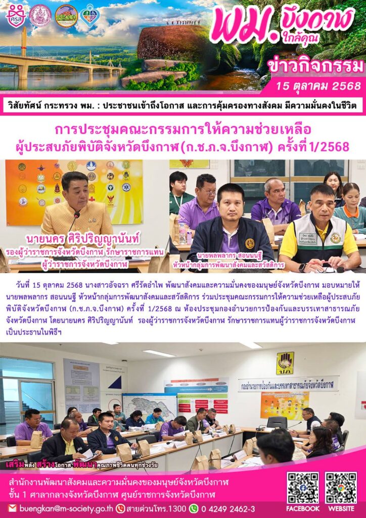 นางสาวอัจฉรา ศรีรัตอำไพ พัฒนาสังคมและความมั่นคงของมนุษย์จังหวัดบึงกาฬ มอบหมายให้ นายพลพลากร สอนนนฐี หัวหน้ากลุ่มการพัฒนาสังคมและสวัสดิการ ร่วมประชุมคณะกรรมการให้ความช่วยเหลือผู้ประสบภัยพิบัติจังหวัดบึงกาฬ (ก.ช.ภ.จ.บึงกาฬ) ครั้งที่ 1/2568 ณ ห้องประชุมกองอำนวยการป้องกันและบรรเทาสาธารณภัยจังหวัดบึงกาฬ โดยนายนคร ศิริปริญญานันท์ รองผู้ว่าราชการจังหวัดบึงกาฬ รักษาราชการแทนผู้ว่าราชการจังหวัดบึงกาฬ เป็นประธานในพิธีฯ