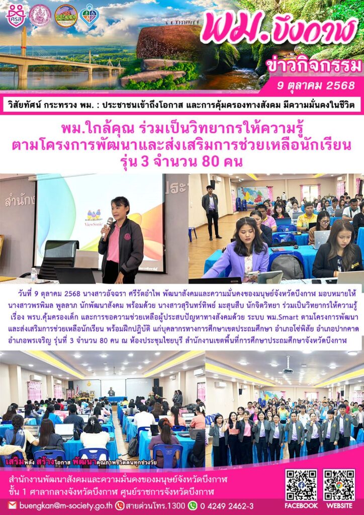 นางสาวอัจฉรา ศรีรัตอำไพ พัฒนาสังคมและความมั่นคงของมนุษย์จังหวัดบึงกาฬ มอบหมายให้ นางสาวพรพิมล พูลลาภ นักพัฒนาสังคม พร้อมด้วย นางสาวสุรินทร์ทิพย์ มะสุนสืบ นักจิตวิทยา ร่วมเป็นวิทยากรให้ความรู้ เรื่อง พรบ.คุ้มครองเด็ก และการขอความช่วยเหลือผู้ประสบปัญหาทางสังคมด้วย ระบบ พม.Smart ตามโครงการพัฒนาและส่งเสริมการช่วยเหลือนักเรียน พร้อมฝึกปฎิบัติ แก่บุคลากรทางการศึกษาเขตประถมศึกษา อำเภอโซ่พิสัย อำเภอปากคาด อำเภอพรเจริญ รุ่นที่ 3 จำนวน 80 คน ณ ห้องประชุมไชยบุรี สำนักงานเขตพื้นที่การศึกษาประถมศึกษาจังหวัดบึงกาฬ