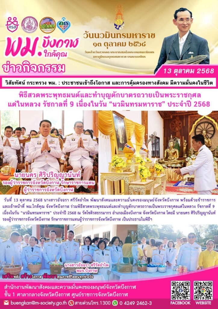 นางสาวอัจฉรา ศรีรัตอำไพ พัฒนาสังคมและความมั่นคงของมนุษย์จังหวัดบึงกาฬ พร้อมด้วยข้าราชการและเจ้าหน้าที่ พม.ใกล้คุณ จังหวัดบึงกาฬ ร่วมพิธีสวดพระพุทธมนต์และทำบุญตักบาตรถวายเป็นพระราชกุศลแด่ในหลวง รัชกาลที่ 9 เนื่องในวัน “นวมินทรมหาราช” ประจำปี 2568 ณ วัดโชติรสธรรมากร อำเภอเมืองบึงกาฬ จังหวัดบึงกาฬ โดยมี นายนคร ศิริปริญญานันท์ รองผู้ว่าราชการจังหวัดบึงกาฬ รักษาราชการแทนผู้ว่าราชการจังหวัดบึงกาฬ เป็นประธานในพิธีฯ