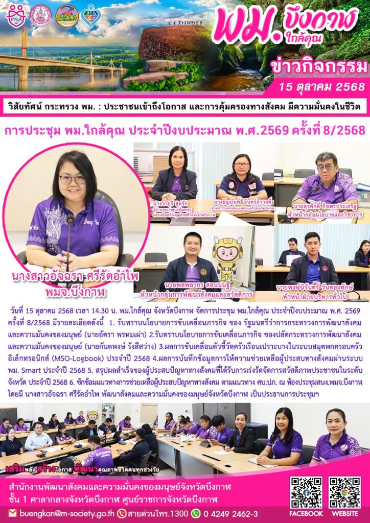 พม.ใกล้คุณ จังหวัดบึงกาฬ จัดการประชุม พม.ใกล้คุณ ประจำปีงบประมาณ พ.ศ. 2569 ครั้งที่ 8/2568 มีรายละเอียดดังนี้ 1. รับทราบนโยบายการขับเคลื่อนภารกิจ ของ รัฐมนตรีว่าการกระทรวงการพัฒนาสังคมและความมันคงของมนุษย์ (นายอัครา พรหมเผ่า) 2.รับทราบนโยบายการขับเคลื่อนภารกิจ ของปลัดกระทรวงการพัฒนาสังคมและความมันคงของมนุษย์ (นายกันตพงษ์ รังสีสว่าง) 3.ผลการขับเคลื่อนตัวชี้วัดครัวเรือนเปราะบางในระบบสมุดพกครอบครัวอิเล็กทรอนิกส์ (MSO-Logbook) ประจำปี 2568 4.ผลการบันทึกข้อมูลการให้ความช่วยเหลือผู้ประสบทางสังคมผ่านระบบ พม. Smart ประจำปี 2568 5. สรุปผลสำเร็จของผู้ประสบปัญหาทางสังคมที่ได้รับการเร่งรัดจัดการสวัสดิภาพประชาชนในระดับจังหวัด ประจำปี 2568 6. ซักซ้อมแนวทางการช่วยเหลือผู้ประสบปัญหาทางสังคม ตามแนวทาง ศบ.ปภ. ณ ห้องประชุมสนง.พมจ.บึงกาฬ โดยมี นางสาวอัจฉรา ศรีรัตอำไพ พัฒนาสังคมและความมั่นคงของมนุษย์จังหวัดบึงกาฬ เป็นประธานการประชุมฯ
