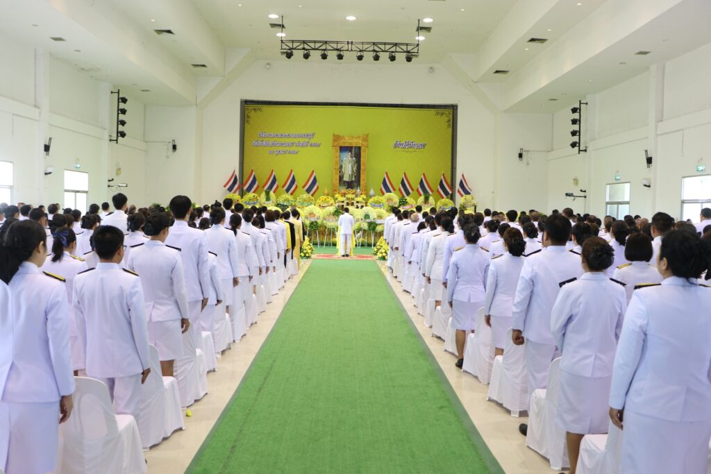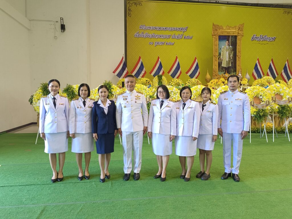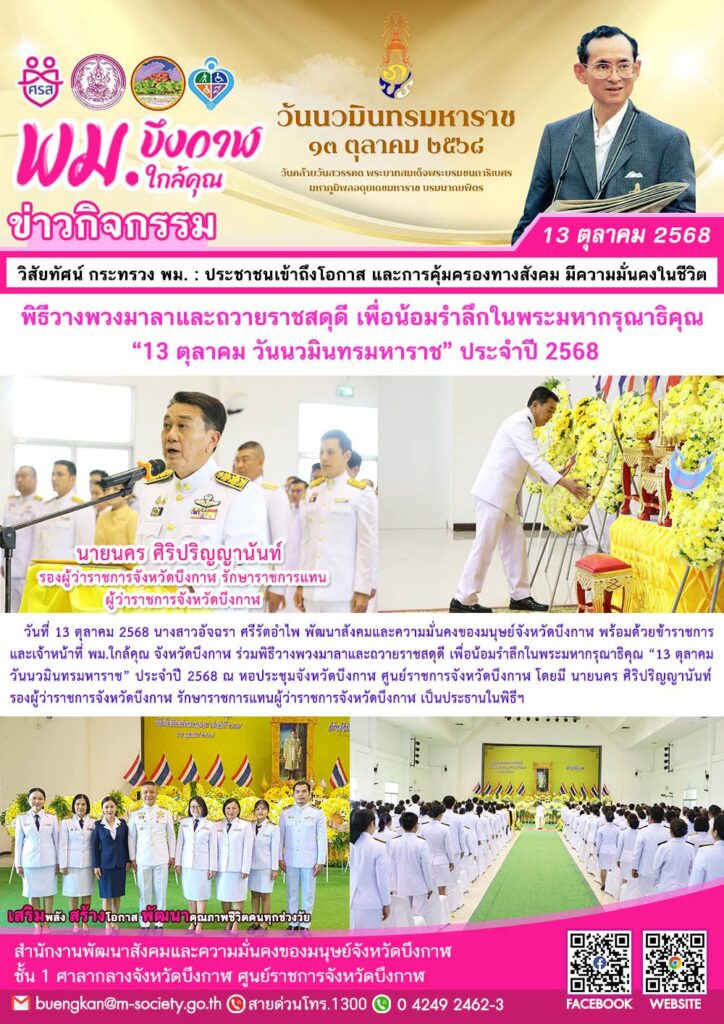 นางสาวอัจฉรา ศรีรัตอำไพ พัฒนาสังคมและความมั่นคงของมนุษย์จังหวัดบึงกาฬ พร้อมด้วยข้าราชการและเจ้าหน้าที่ พม.ใกล้คุณ จังหวัดบึงกาฬ ร่วมพิธีวางพวงมาลาและถวายราชสดุดี เพื่อน้อมรำลึกในพระมหากรุณาธิคุณ “13 ตุลาคม วันนวมินทรมหาราช” ประจำปี 2568 ณ หอประชุมจังหวัดบึงกาฬ ศูนย์ราชการจังหวัดบึงกาฬ โดยมี นายนคร ศิริปริญญานันท์ รองผู้ว่าราชการจังหวัดบึงกาฬ รักษาราชการแทนผู้ว่าราชการจังหวัดบึงกาฬ เป็นประธานในพิธีฯ