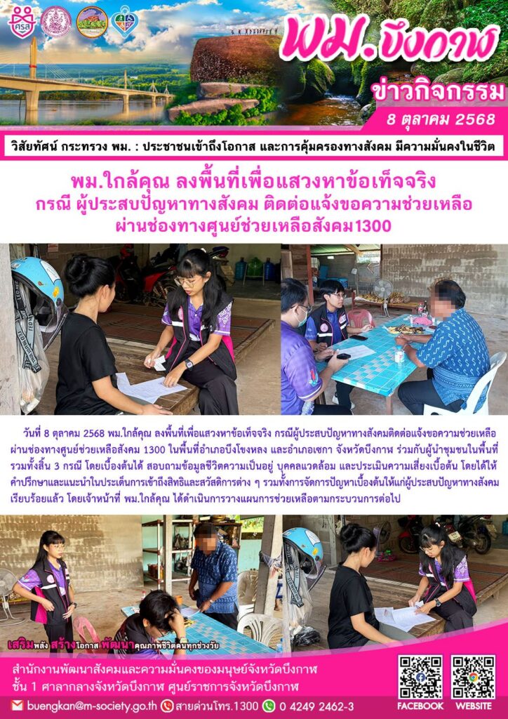 พม.ใกล้คุณ ลงพื้นที่เพื่อแสวงหาข้อเท็จจริง กรณี ผู้ประสบปัญหาทางสังคมติดต่อแจ้งขอความช่วยเหลือผ่านช่องทางศูนย์ช่วยเหลือสังคม 1300 ในพื้นที่อำเภอบึงโขงหลง และอำเภอเซกา จังหวัดบึงกาฬ ร่วมกับผู้นำชุมชนในพื้นที่ รวมทั้งสิ้น 3 กรณี