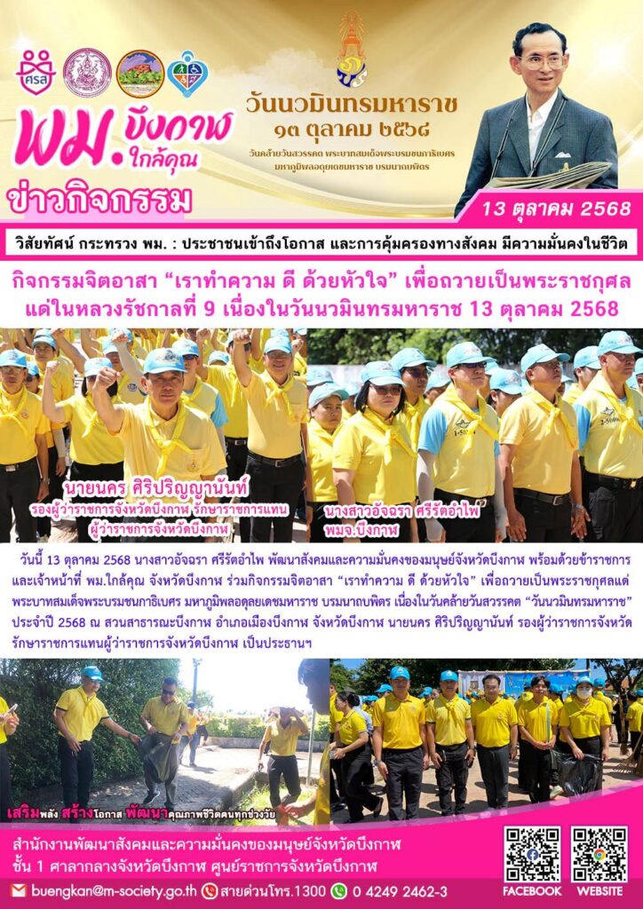 นางสาวอัจฉรา ศรีรัตอำไพ พัฒนาสังคมและความมั่นคงของมนุษย์จังหวัดบึงกาฬ พร้อมด้วยข้าราชการและเจ้าหน้าที่ พม.ใกล้คุณ จังหวัดบึงกาฬ ร่วมกิจกรรมจิตอาสา “เราทำความ ดี ด้วยหัวใจ” เพื่อถวายเป็นพระราชกุศลแด่พระบาทสมเด็จพระบรมชนกาธิเบศร มหาภูมิพลอดุลยเดชมหาราช บรมนาถบพิตร เนื่องในวันคล้ายวันสวรรคต “วันนวมินทรมหาราช” ประจำปี 2568 ณ สวนสาธารณะบึงกาฬ อำเภอเมืองบึงกาฬ จังหวัดบึงกาฬ นายนคร ศิริปริญญานันท์ รองผู้ว่าราชการจังหวัด รักษาราชการแทนผู้ว่าราชการจังหวัดบึงกาฬ เป็นประธานฯ